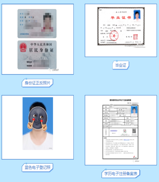 专升本——身份证正反照片、蓝色电子登记照、高职毕业证、学信网学历电子注册备案表