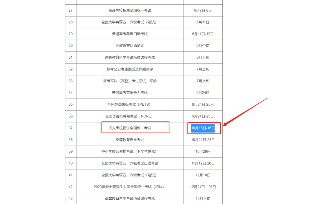 贵州省基础教育笔试院已发布【2022年度笔试项目】,其中表格中已公开2022年成人高考笔试天数为:10月15日-16日(成人高考笔试为全省统一笔试)。各项笔试天数以基础教育部最终公布天数为准。