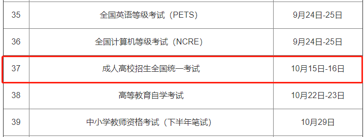 成人高考(成年人高校录取全省标准化笔试),笔试天数是全省各省标准化的,依照部份省基础教育笔试院(云南省等)正式发布的《2022本年度笔试工程项目》由此可知,2022年成人高考笔试天数原订为10月15日至16日。