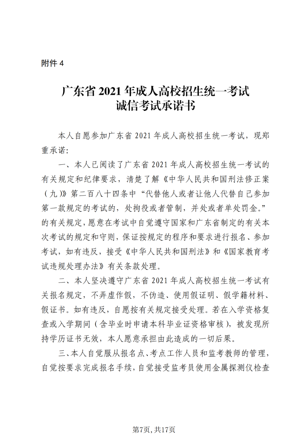 4.珠海市2021年成年人院校录取标准化笔试诚信笔试承诺书